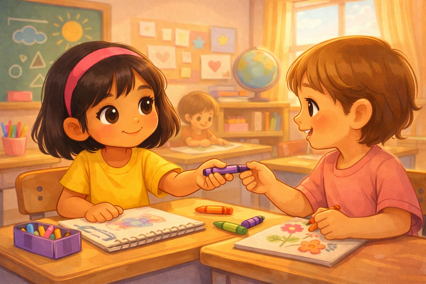 Mimi opened her crayon box and paused. Her favorite purple crayon was missing. She looked around and saw Arya using it.