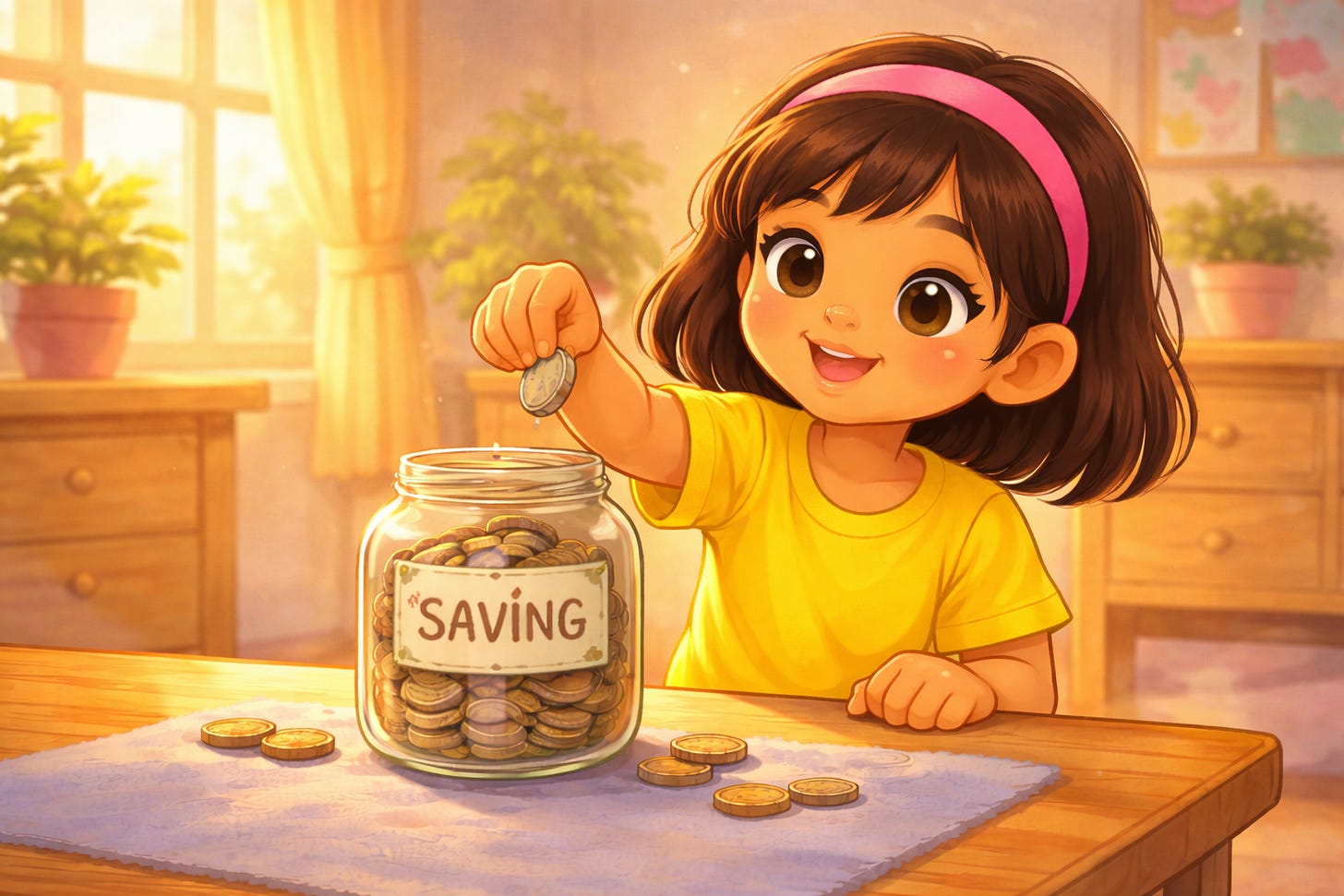 A small glass jar sat on Mimi’s table, shining in the afternoon light. It made a soft clink when coins dropped inside.