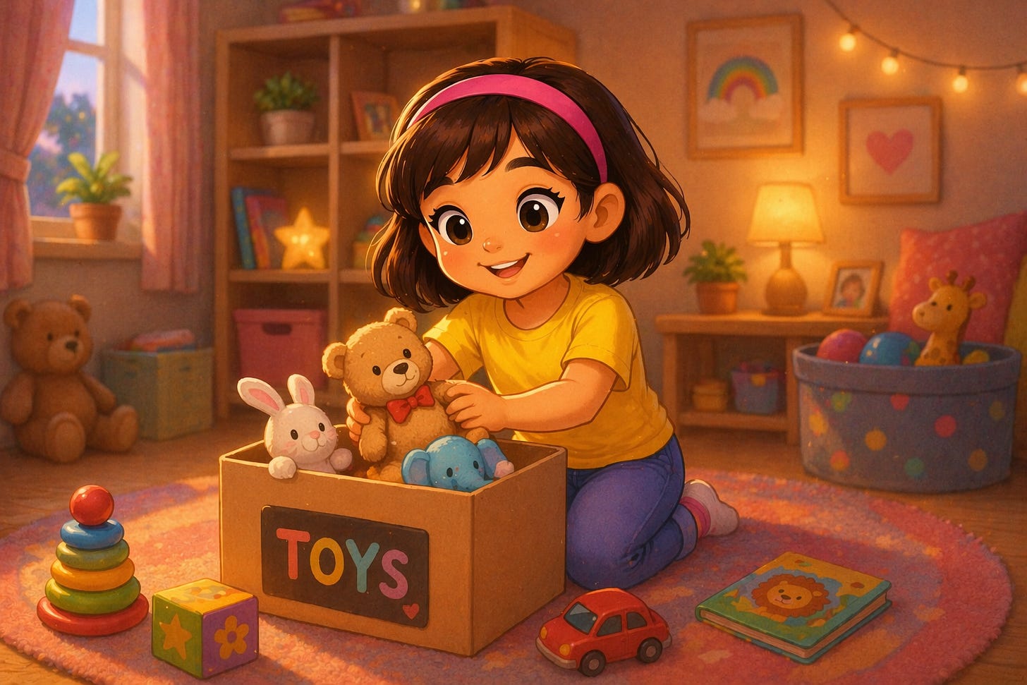 The room looked messy after playtime, with toys scattered all around the floor. The evening felt quiet.